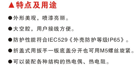 電線管與接線盒連接,線管里面的電線在接線盒中連起來,起到保護(hù)電線和連接電線的作用。熱電偶和熱電阻接線盒是用來固定接線座和作為連接器的裝置,它起著保護(hù)感溫元件免受外界氣氛侵蝕和使外接導(dǎo)線與接線柱接觸良好的作用,根據(jù)被測量溫度對象和現(xiàn)場環(huán)境條件及要求,除了普通型接線盒外,還有防濺型、防水型、防爆型、接插型、不銹鋼、塑料和一體化溫度變送器等接線盒。我們?nèi)绻麑⒏鞣N類型的接線盒裝配成熱電偶和熱電阻產(chǎn)品,則這些產(chǎn)品相應(yīng)即為防濺型、防水型和接插型等熱電偶和熱電阻了。