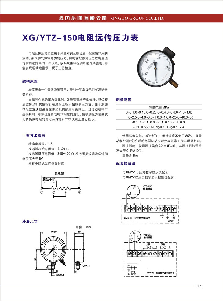 XG-YTZ-150電阻遠(yuǎn)傳壓力表: