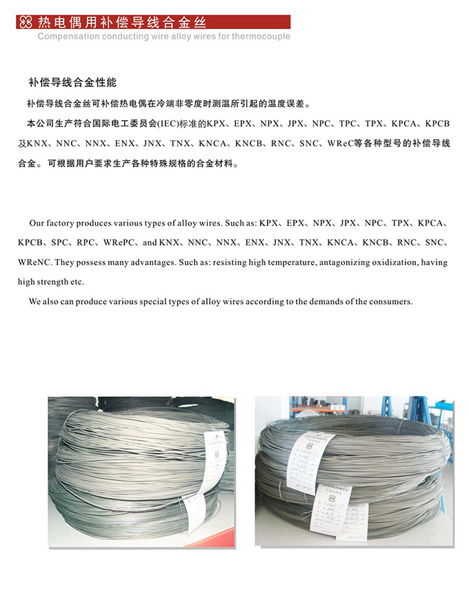 本公司生產符合國 際電工委員會( IEC )標準的 KPX、EPX、NPX、JPX、NPC、TPC、TPX、KPCA、KPCB及KNX、ENX、NNX、JNX、NNC、TNX、KNCA、KNCB、RNC、SNC、LNX、WReC 等各種型號的補償導線合金絲。可根據用戶要求生產各種特殊規格的合金材料。
