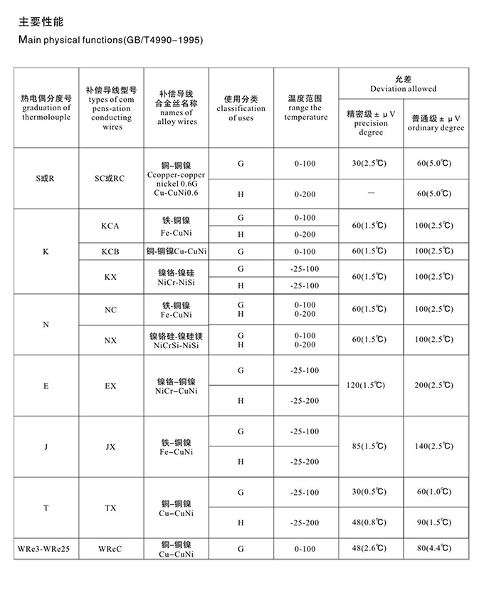 補償導線合金性能: 補償導線合金絲可補償熱電偶在冷端非零度時測溫所引起的溫度誤差。 本公司生產符合國 際電工委員會( IEC )標準的 KPX 、 EPX 、 NPX 、 JPX 、 NPC 、
