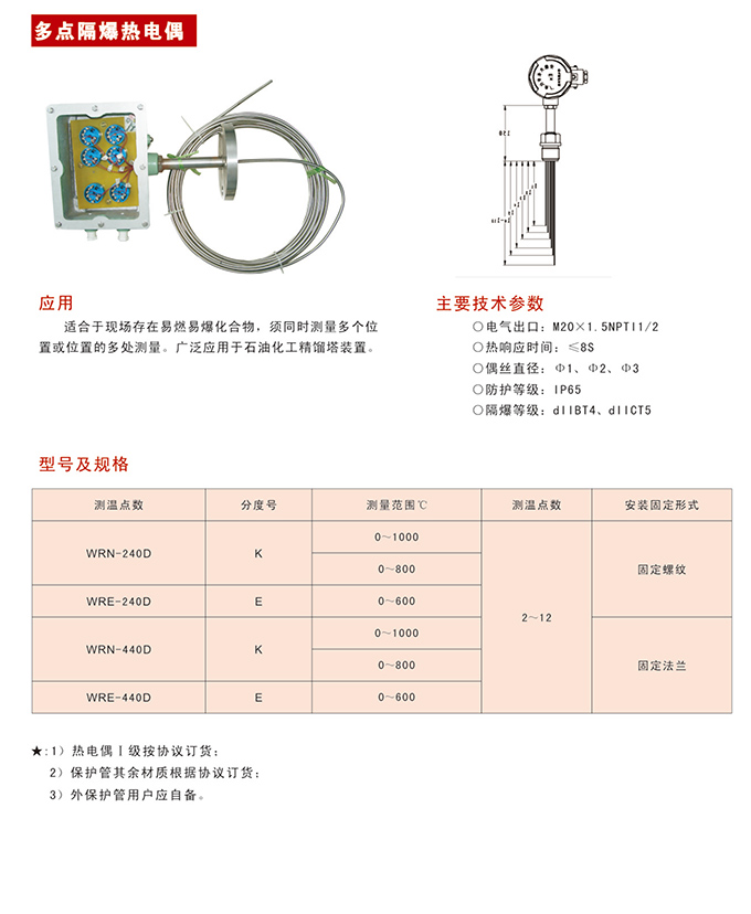 多點防爆熱電偶,適合于現場存在易燃易爆化合物,須同時測量多個位置或位置的多處測量。多點防爆熱電偶廣泛應用于石油化工精餾塔裝置。 主要技術參數: O 電氣出口:M20X1.5,NPTI1/2