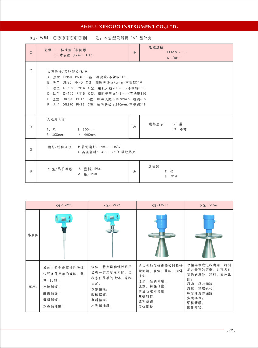 智能雷達物位儀, XG /LW5X系列雷達物位計是采用微波技術來檢 測料位的高科技產品,該物位儀利用微波具有穿透性好,對惡劣環境及被測物料適應性強等特點,采用世 界上先進的大規模集成電路,利用雷達原理,數字信號處理技術和快速傅里葉變換(FFT)技術。采用非接觸式連續測量,能測量液體、固體(塊狀、粉狀)料位,具有測距遠(70米),精度高,免維護等特點。